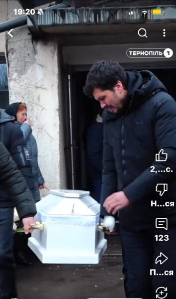Для мене, автора цього повідомлення, це фото скорботного батька є найсумнішою, найсильніше зворушливою та найглибше торкаючою з усіх десяти фотографій, які Алена додала до трьох повідомлень, надісланих мені — батько несе свого сина до останнього місця його спочинку — могили, ями в землі.